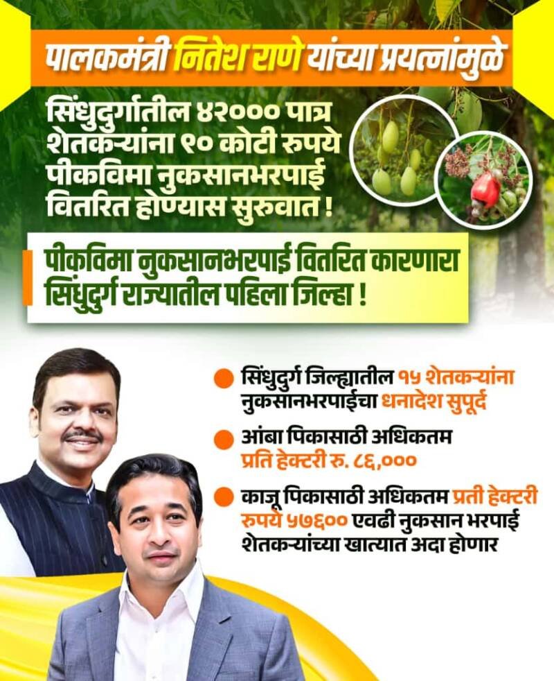 рд╕рди реирежреирек-реирел рдордзреНрдпреЗ рдЬрд┐рд▓реНрд╣реНрдпрд╛рддреАрд▓ рдЬрд╡рд│рдкрд╛рд╕ рекреирежрежреж рдкрд╛рддреНрд░ рд╢реЗрддрдХрд▒реНрдпрд╛рдВрдирд╛ рдЬрд╡рд│рдкрд╛рд╕ рд░рдХреНрдХрдо рд░реБ.репреж рдХреЛрдЯреА рдПрд╡рдвреА рд╡рд┐рдорд╛ рдиреБрдХрд╕рд╛рди рднрд░рдкрд╛рдИ рд░рдХреНрдХрдо рджрд┐рд╡рд╛рд│реАрдкреВрд░реНрд╡реА рд╡рд┐рддрд░реАрдд рдХрд░рдгреНрдпрд╛рдд рдпреЗрдд рдЖрд╣реЗ. рдпрд╛рдордзреНрдпреЗ рдЖрдВрдмрд╛ рдкрд┐рдХрд╛рд╕рд╛рдареА рдЕрдзрд┐рдХрддрдо рдкреНрд░рддрд┐ рд╣реЗрдХреНрдЯрд░реА рд░реБрдкрдпреЗ реоремрежрежреж/- рддрд░ рдХрд╛рдЬреВ рдкрд┐рдХрд╛рд╕рд╛рдареА рдЕрдзрд┐рдХрддрдо рдкреНрд░рддреА рд╣реЗрдХреНрдЯрд░реА рд░реБрдкрдпреЗ релренремрежреж/- рдПрд╡рдвреА рдиреБрдХрд╕рд╛рди рднрд░рдкрд╛рдИ рд╢реЗрддрдХрд▒реНрдпрд╛рдВрдЪреНрдпрд╛ рдЦрд╛рддреНрдпрд╛рдд рдЕрджрд╛ рд╣реЛрдгрд╛рд░ рдЖрд╣реЗ. рдЖрдЬ рдЭрд╛рд▓реЗрд▓реНрдпрд╛ рдХрд╛рд░реНрдпрдХреНрд░рдорд╛рдд рдпрд╛рддреАрд▓ резрел рд╢реЗрддрдХрд▒реНрдпрд╛рдВрдирд╛ рдиреБрдХрд╕рд╛рдирднрд░рдкрд╛рдИрдЪрд╛ рдзрдирд╛рджреЗрд╢ рд╕реБрдкреВрд░реНрдж рдХрд░рдгреНрдпрд╛рдд рдЖрд▓рд╛. рдкрд╛рд▓рдХрдордВрддреНрд░реА рдирд┐рддреЗрд╢ рд░рд╛рдгреЗ рдпрд╛рдВрдЪреНрдпрд╛ рд╡рд┐рд╢реЗрд╖ рдкреНрд░рдпрддреНрдирд╛рдВрдореБрд│реЗ рд╢реЗрддрдХрд▒реНрдпрд╛рдВрдирд╛ рдиреБрдХрд╕рд╛рдирднрд░рдкрд╛рдИрдЪрд╛ рд▓рд╛рдн рдорд┐рд│рд╛рд▓рд╛ рдЖрд╣реЗ. рд╢реЗрддрдХрд▒реНрдпрд╛рдВрдирд╛ рдкреАрдХрд╡рд┐рдорд╛ рдиреБрдХрд╕рд╛рдирднрд░рдкрд╛рдИ рд╡рд┐рддрд░рд┐рдд рдХрд╛рд░рдгрд╛рд░рд╛ рд╕рд┐рдВрдзреБрджреБрд░реНрдЧ рд╣рд╛ рд░рд╛рдЬреНрдпрд╛рддреАрд▓ рдкрд╣рд┐рд▓рд╛ рдЬрд┐рд▓реНрд╣рд╛ рдард░рд▓рд╛ рдЖрд╣реЗ.