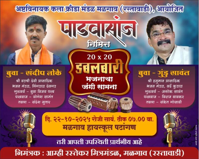 рдмреБрд╡рд╛ рд╕рдВрджреАрдк рд▓реЛрдХреЗ (рд╢реНрд░реА рд╡рдбрдЪреА рджреЗрд╡реА рдкреНрд░рд╛рд╕рд╛рджрд┐рдХ рднрдЬрди рдордВрдбрд│, рд▓рд┐рдВрдЧрдбрд╛рд│ рджреЗрд╡рдЧрдб) рд╡ рдмреБрд╡рд╛ рдЧреБрдВрдбреБ рд╕рд╛рд╡рдВрдд (рд╢реНрд░реА рд╣рдиреБрдорд╛рди рдкреНрд░рд╛рд╕рд╛рджрд┐рдХ рднрдЬрди рдордВрдбрд│, рд╡рд░реНрджреЗ рдХреБрдбрд╛рд│) рдпрд╛рдВрдЪреНрдпрд╛рдд рд╣рд╛ рд╕рд╛рдордирд╛ рд╣реЛрдгрд╛рд░ рдЖрд╣реЗ. рд╕рдВрджреАрдк рд▓реЛрдХреЗ рдпрд╛рдВрдирд╛ рдкрдЦрд╡рд╛рдЬ рд╕рд╛рде рдпреЛрдЧреЗрд╢ рд╕рд╛рдордВрдд рддрд░ рддрдмрд▓рд╛ рд╕рд╛рде рд╕рдВрджреЗрд╢ рд╕реБрддрд╛рд░ рдХрд░рдгрд╛рд░ рдЖрд╣реЗрдд. рддрд░ рдЧреБрдВрдбреБ рд╕рд╛рд╡рдВрдд рдпрд╛рдВрдирд╛ рдкрдЦрд╡рд╛рдЬ рд╕рд╛рде рд╡рд┐рд░рд╛рдЬ рдмрд╛рд╡рдХрд░ рд╡ рддрдмрд▓рд╛ рд╕рд╛рде рд╕рдВрдХреЗрдд рдЧреЛрд╕рд╛рд╡реА рдХрд░рдгрд╛рд░ рдЖрд╣реЗрдд. рдорд│рдЧрд╛рд╡ рддрд╕реЗрдЪ рдкрд░рд┐рд╕рд░рд╛рддреАрд▓ рдбрдмрд▓рдмрд╛рд░реА рднрдЬрдирдкреНрд░реЗрдореАрдВрдиреА рдпрд╛ рдбрдмрд▓рдмрд╛рд░реА рд╕рд╛рдордиреНрдпрд╛рдЪрд╛ рд▓рд╛рдн рдШреНрдпрд╛рд╡рд╛, рдЕрд╕реЗ рдЖрд╡рд╛рд╣рди рдЖрдореНрд╣реА рд░рд╕реНрддреЗрдХрд░ рдорд┐рддреНрд░рдордВрдбрд│ рд╡ рдЕрд╖реНрдЯрд╡рд┐рдирд╛рдпрдХ рдХрд▓рд╛ рдХреНрд░реАрдбрд╛ рдордВрдбрд│рд╛рдЪреНрдпрд╛рд╡рддреАрдиреЗ рдХрд░рдгреНрдпрд╛рдд рдЖрд▓реЗ рдЖрд╣реЗ.